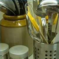 (For efficiency, I suggest putting your spoons, spatulas, microplanes, peelers, measuring cups, etc. in the closest drawer to your stove so they are easily accessible when you are cooking. Also you can find some unique bottles or antique jars and keep them on your counter.)