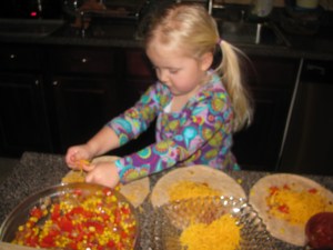 4. Roll and Cook. Roll the tortillas up and put ona cookie sheet. Scatter over the rest of the cheese and broil the quesadillas in the oven for 1-2 minutes until the filling is hot and the cheese is lightly golden brown. (Parents will want to put the quesadillas in and remove from the oven.)