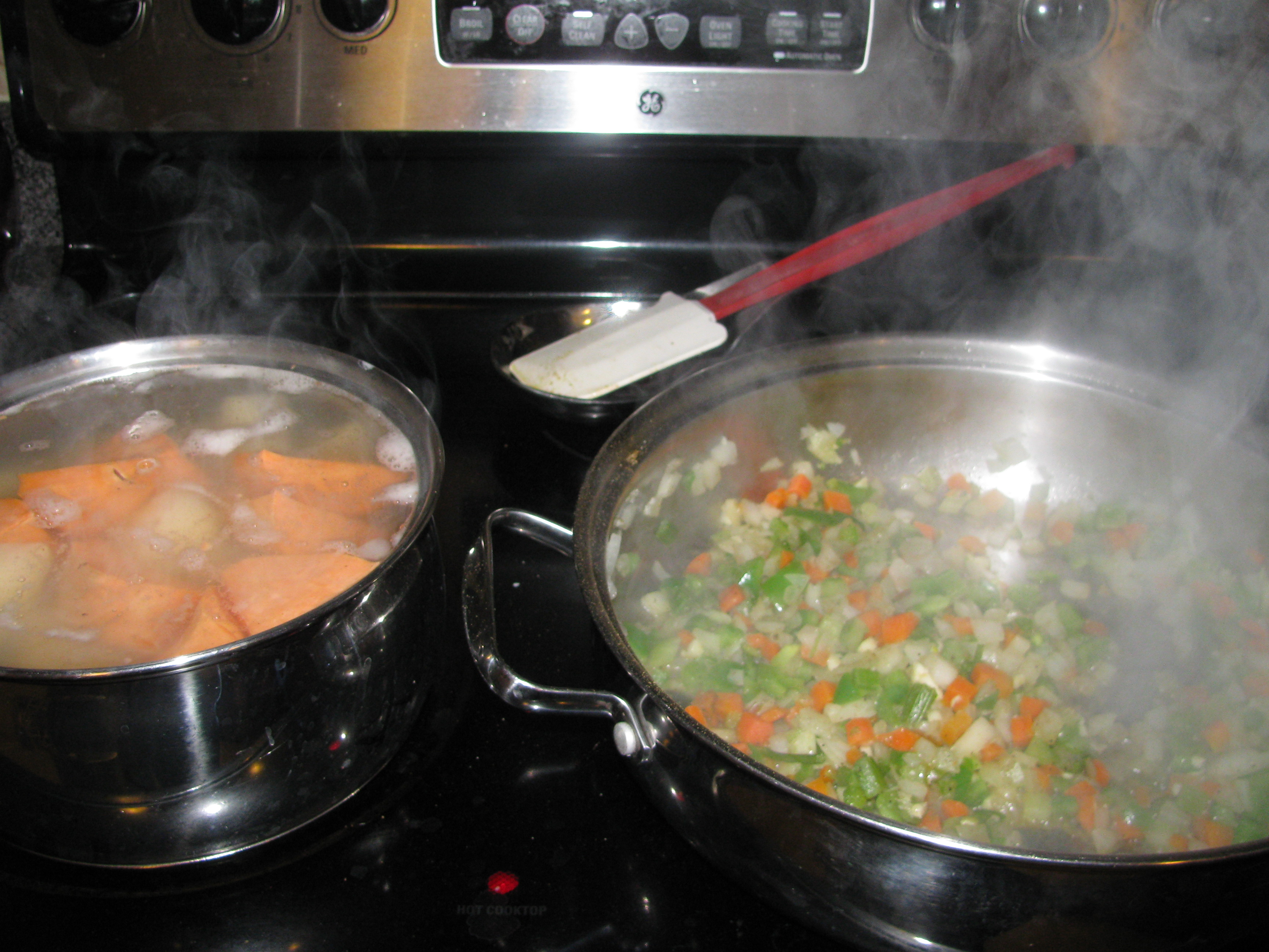 In a medium sauce pan add quartered sweet potatoes and bring to a boil. Cook until the potatoes will break apart by a fork. (around 15-20 minutes )