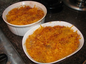 Back to the dutch oven; Spread the mixture to create an even layer on the bottom of the pan. Add a middle layer of sliced mushrooms and pour the cream of mushroom soup all over the top. Add the mashed sweet potatoes as the final layer and top with shredded cheddar cheese. Season with a bit of cracked black pepper and sprinkle some paprika over the top for added color. ( Note: for a smaller family, you can make two or even three of these depending on the size casserole dish you wish to use, and store the other(s) for another night during the week like I did)