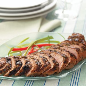 Preheat the grill to medium-hot. Add the pork and brush with its marinade. Grill turning 2-3 times, for 20 minutes or until nicely browned and an instant read thermometer inserted in the center reads 150-155 degrees. Remove from the grill and let stand for 10 minutes.