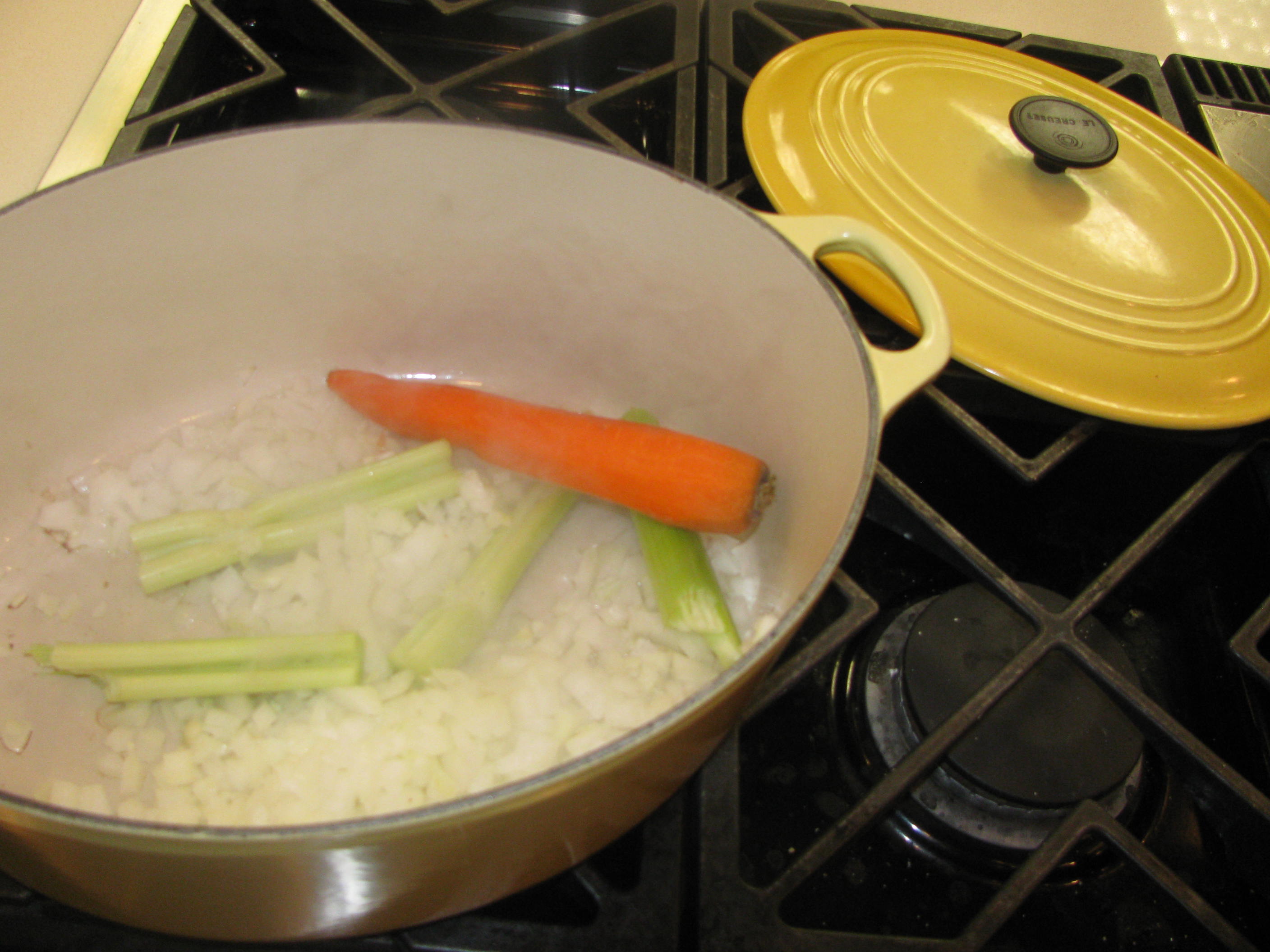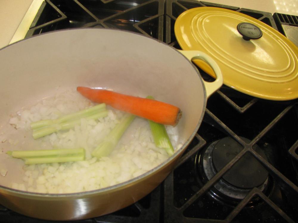 In a large cast iron enamel pan or dutch oven heat the olive oil on medium high heat. Add the onions and garlic and saute for about a minute or until the onions start to sweat and the garlic is starting to brown. Add the celery and carrot, and turkey leg.