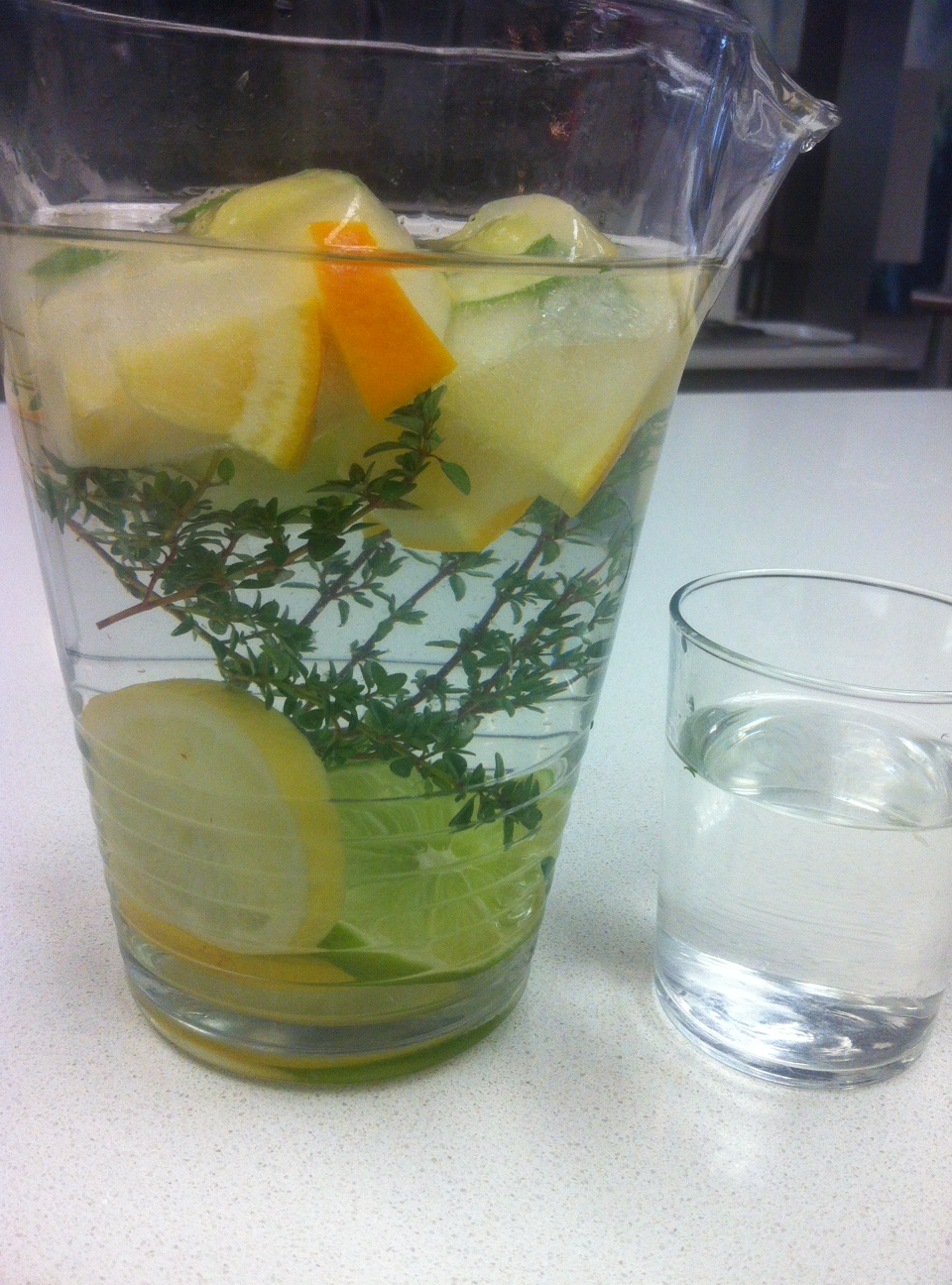 Now for the wow factor…take a standard size muffin pan and fill each one with a combination of orange wedges, thyme, mint, lemon, or lime and fill each pan with water. Place in the freezer and you will have beautiful ice cubes that will flavor your water and float for a fun presentation.