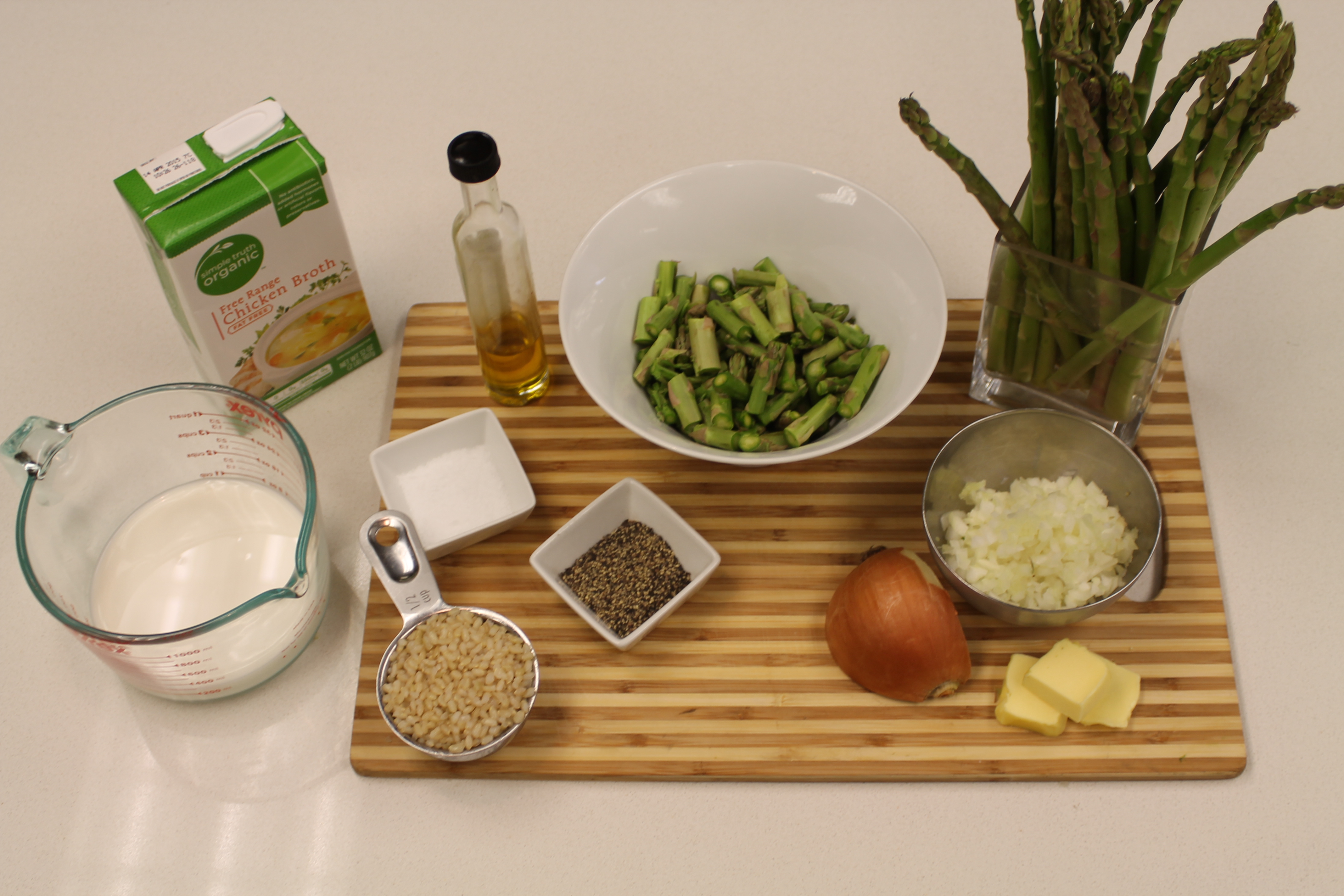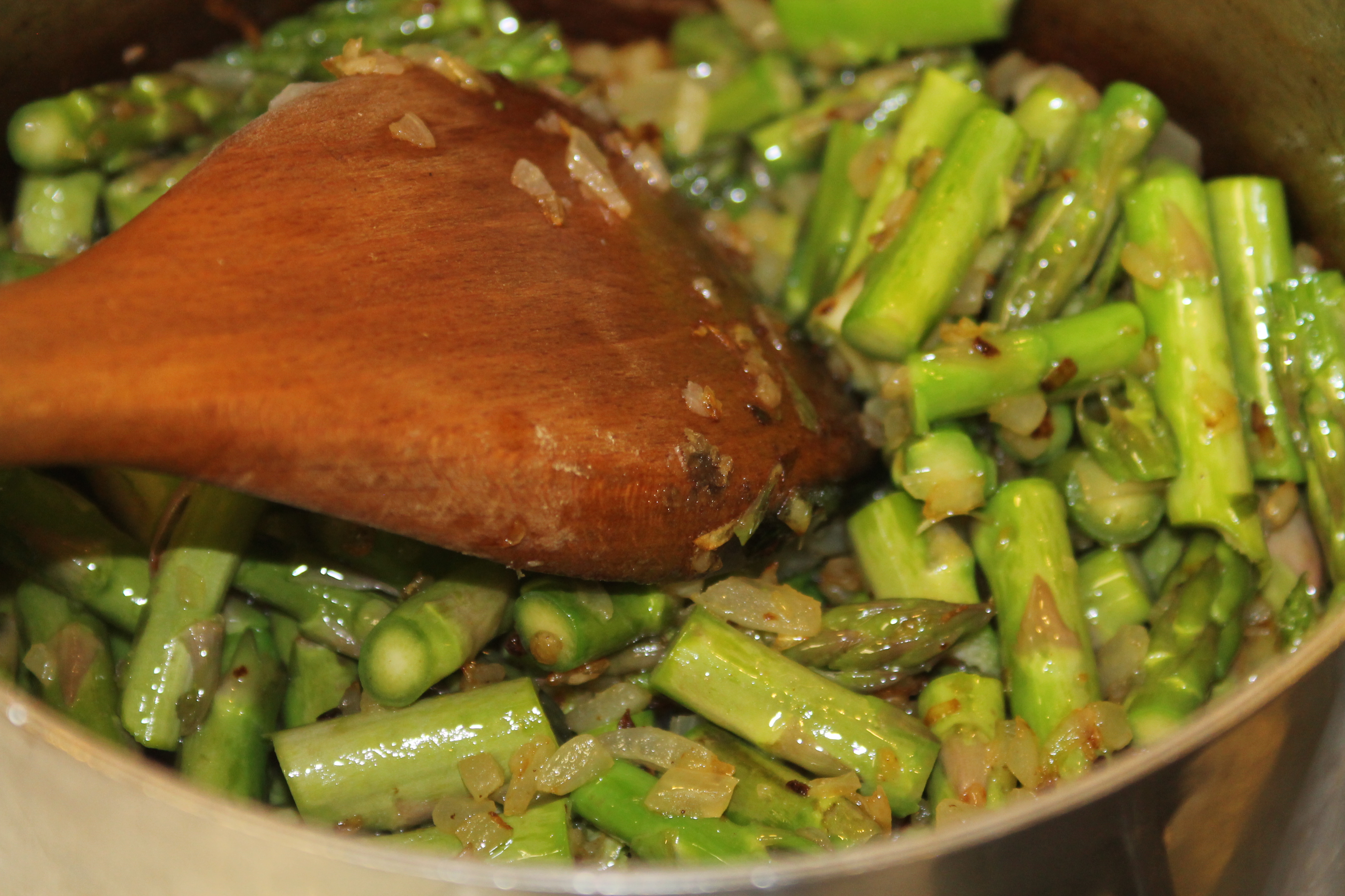 Add the butter to medium-sized saucepan and melt over medium heat. Add the onions and sauté until they are soft and just starting to brown around the edges. Add the asparagus, milk, chicken stock and rice. Simmer over medium low heat for 10 minutes or until the asparagus and rice are soft.