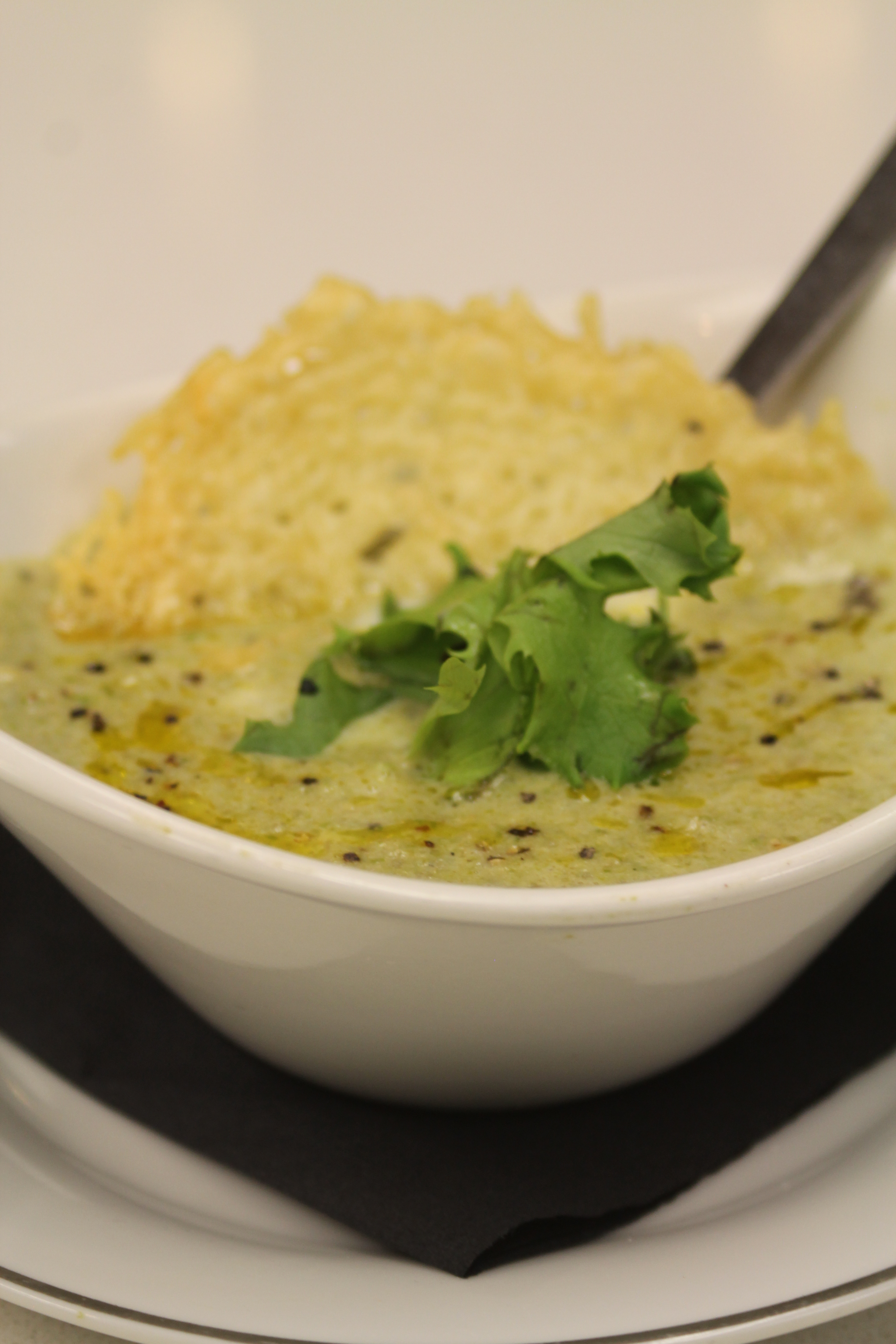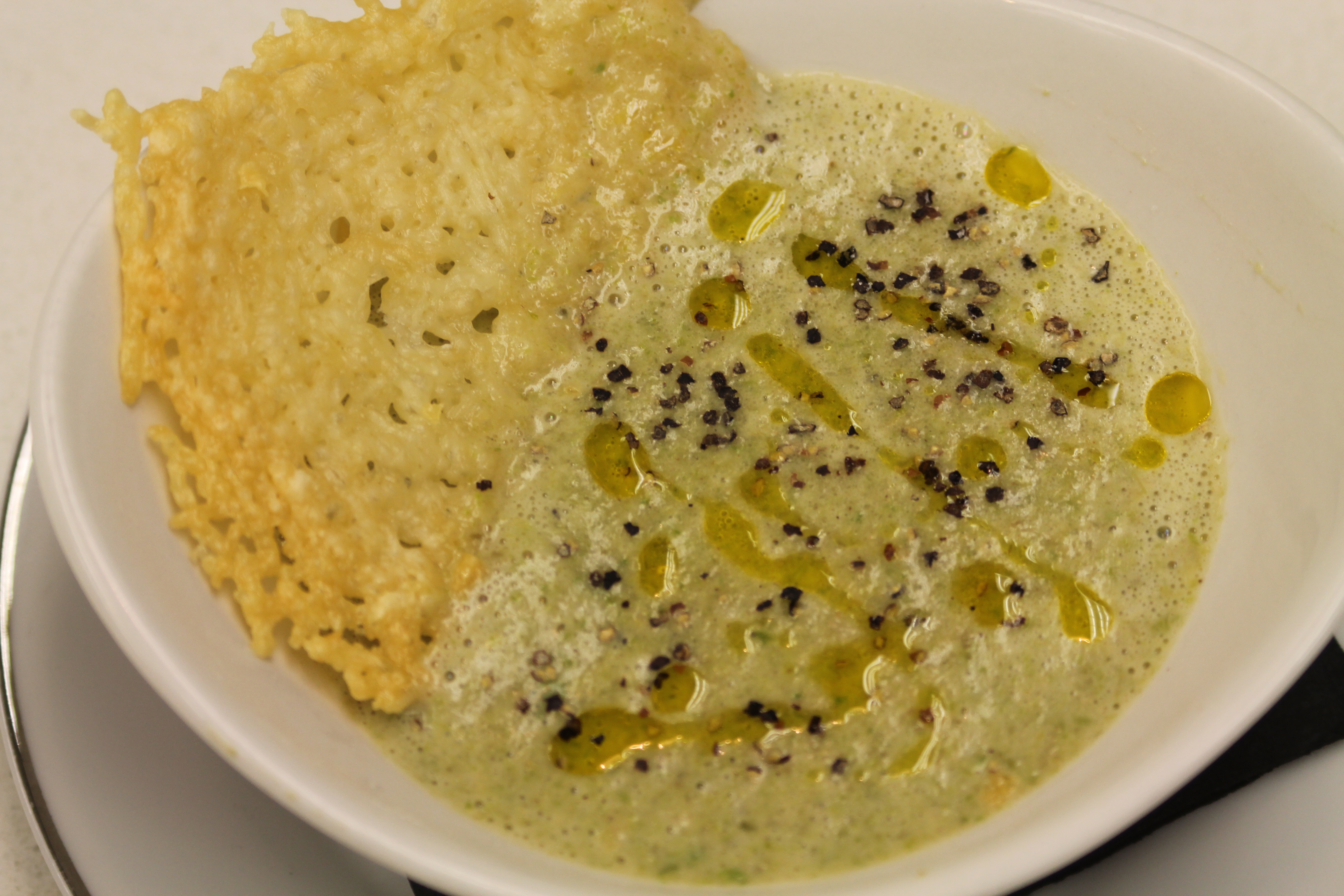 Using an immersion (stick or wand) blender, puree the soup until a consistent smooth texture. Garnish with white truffle oil and parmesan crisp. Micro greens would make a nice top, crème fraiche, lemon zest, the possibilities are endless!